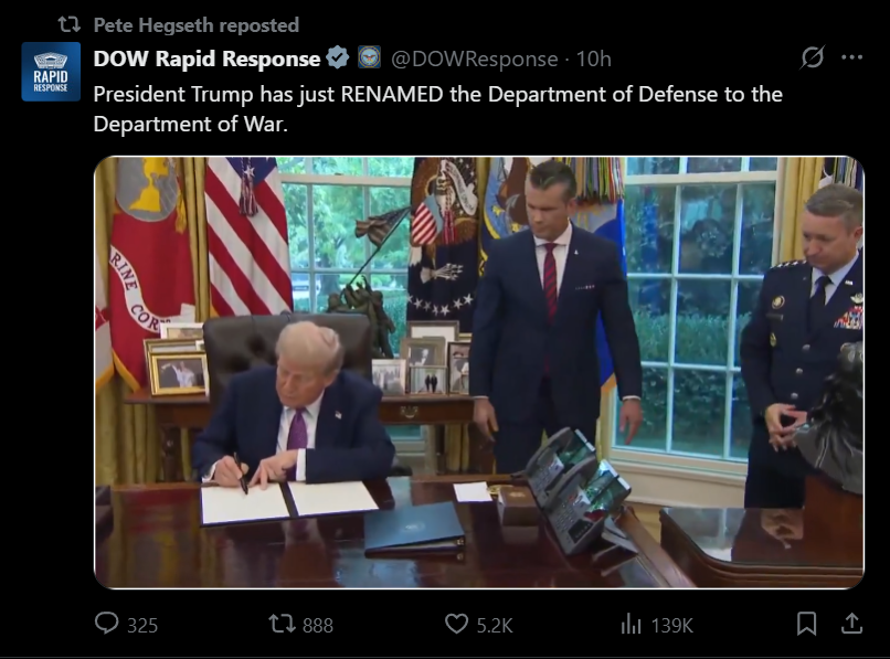 No Pentágono, as autoridades atualizaram as placas externas do escritório do Secretário de Defesa, Pete Hegseth, e o site oficial foi renovado. O endereço defense.gov agora redireciona para war.gov, que orgulhosamente exibe “Departamento de Guerra dos EUA” em seu cabeçalho. A sigla DOD (Departamento de Defesa) foi substituída por DOW (Departamento de Guerra) em diversas publicações.