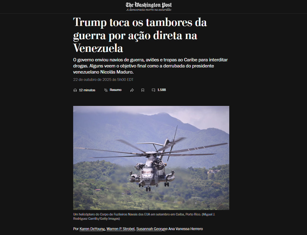 Essa escalada integraria a campanha que o governo de Donald Trump conduz no mar do Caribe, próximo à costa venezuelana, sob o pretexto de combater traficantes de drogas rumo aos Estados Unidos.