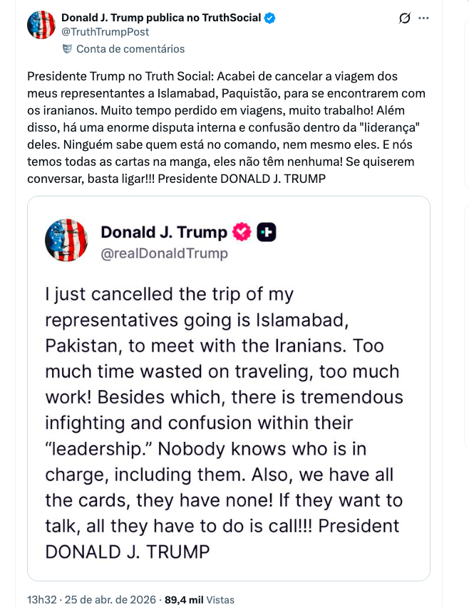 O presidente Donald Trump anunciou neste sábado (25 de abril de 2026) o cancelamento da viagem de seus representantes a Islamabad, no Paquistão, onde ocorreriam novas rodadas de negociações indiretas com o Irã.