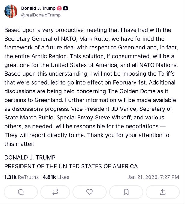 “Com base em uma reunião muito produtiva que tive com o Secretário-Geral da OTAN, Mark Rutte, definimos a estrutura de um futuro acordo referente à Groenlândia e, na verdade, a toda a região do Ártico. Essa solução, se concretizada, será excelente para os Estados Unidos da América e para todos os países da OTAN. Com base nesse entendimento, não imporei as tarifas que entrariam em vigor em 1º de fevereiro. Discussões adicionais estão sendo realizadas a respeito da Cúpula Dourada, no que diz respeito à Groenlândia. Mais informações serão disponibilizadas conforme o andamento das discussões. O Vice-Presidente JD Vance, o Secretário de Estado Marco Rubio, o Enviado Especial Steve Witkoff e outros, conforme necessário, serão responsáveis pelas negociações — e se reportarão diretamente a mim. Agradeço a atenção dispensada a este assunto!”