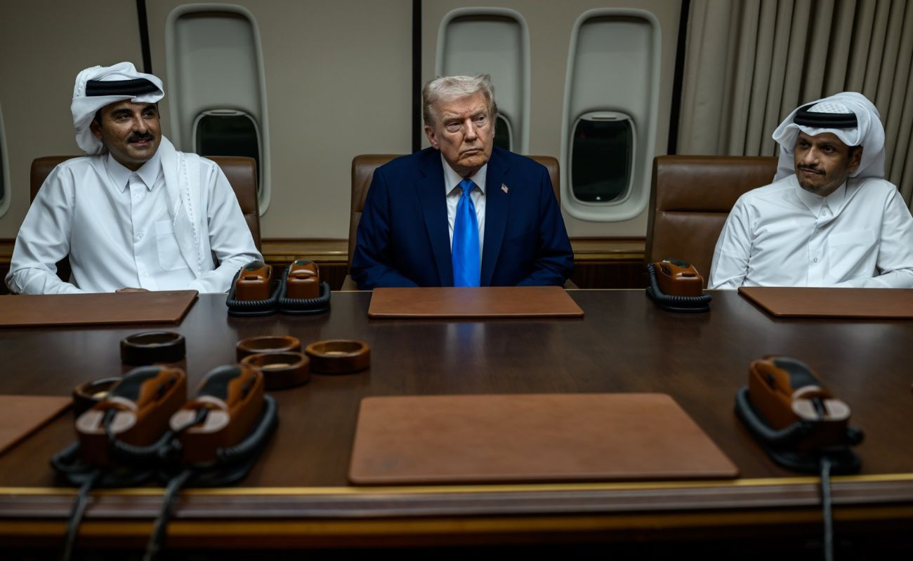 A bordo do Air Force One, na Base Aérea Al Udeid, sede do quartel-general regional das forças militares americanas, Trump cumprimentou o emir do Catar, xeque Tamim bin Hamad Al-Thani, e o primeiro-ministro, xeque Mohamed bin Abdulrahman Al-Thani.