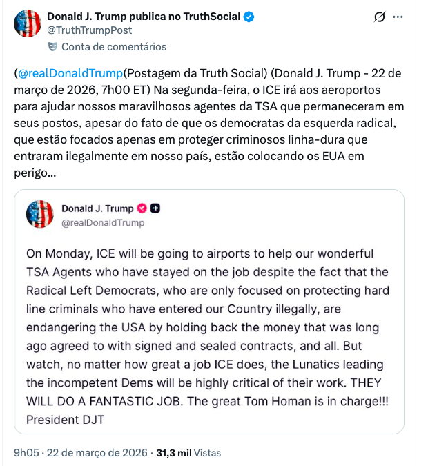 “Na segunda-feira, o ICE irá aos aeroportos para ajudar nossos maravilhosos agentes da TSA que permaneceram em seus postos de trabalho”.