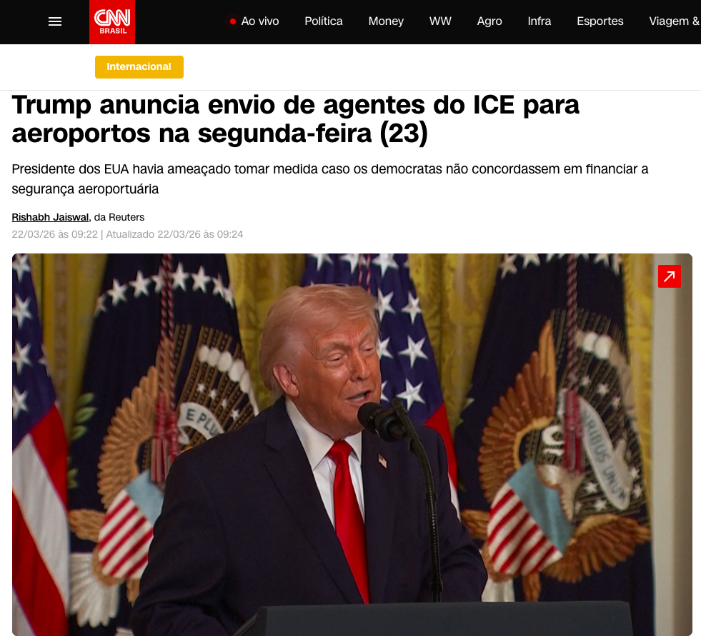 O anúncio segue uma ameaça feita no sábado (21), quando Trump condicionou o envio dos agentes à falta de acordo imediato dos democratas no Congresso para aprovar recursos à segurança aeroportuária e encerrar o shutdown do DHS — departamento responsável pela polícia migratória, fronteiras e segurança de transportes. A paralisação tem causado escassez de pessoal na TSA, resultando em longas filas e atrasos em aeroportos, especialmente em período de alta demanda de viagens.