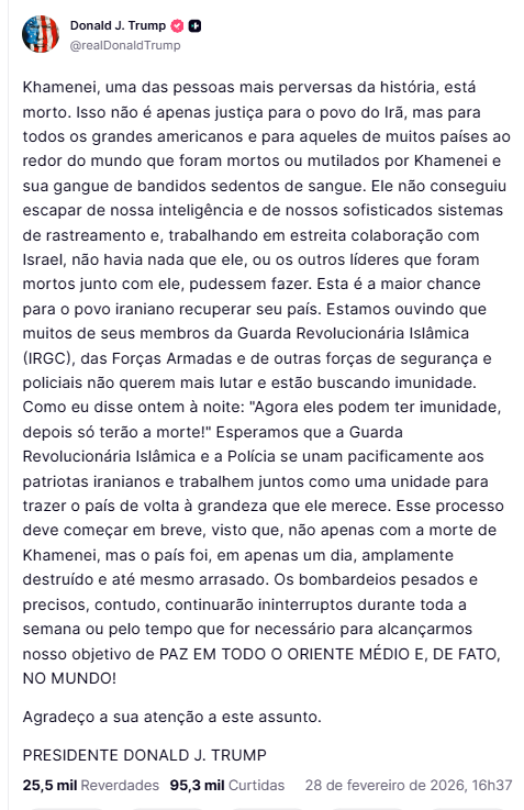 Em mensagem publicada na plataforma Truth Social, Trump classificou Khamenei como “uma das pessoas mais más da história” e afirmou que sua eliminação representa “uma oportunidade para o povo iraniano” recuperar o controle do país após décadas de regime teocrático. A declaração veio após relatos de imprensa israelense e internacional indicarem que o aiatolá foi atingido em bombardeios no complexo residencial em Teerã, gerando incertezas iniciais sobre seu paradeiro.