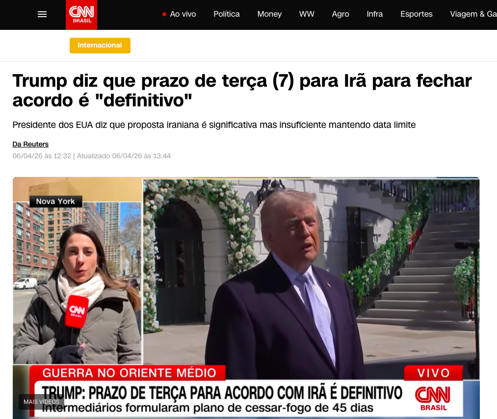 O presidente dos Estados Unidos, Donald Trump, afirmou nesta segunda-feira (6 de abril de 2026) que o prazo estabelecido para o Irã fechar um acordo é “definitivo”. A data limite continua sendo terça-feira (7 de abril), de acordo com a matéria da CNN BRASIL.
