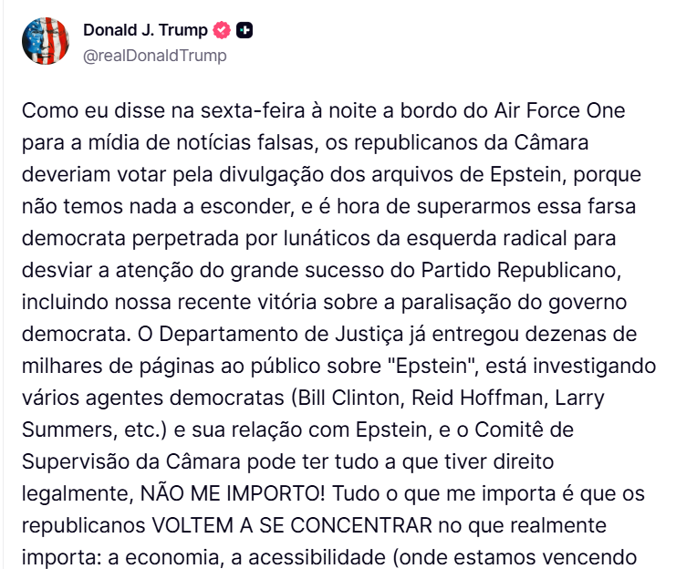 Neste domingo (16), o presidente do país, Donald Trump, afirmou, que os deputados republicanos devem votar pela divulgação dos arquivos do caso Epstein.