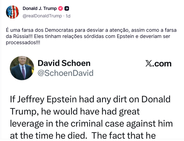 “Ninguém se importava com Jeffrey Epstein quando ele estava vivo e, se os Democratas tivessem qualquer coisa, teriam divulgado antes da nossa vitória eleitoral por lavada”, continuou.