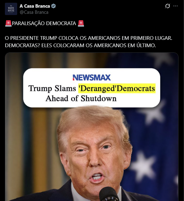 A Casa Branca usou seu perfil oficial nas redes sociais para reforçar o discurso de Trump. Na rede social X, postou o print de uma reportagem com declarações do presidente afirmando que seus adversários políticos “querem destruir o sistema de saúde da América dando milhões a imigrantes ilegais” e escreveu: