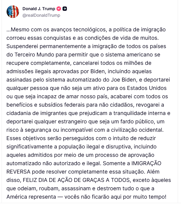 “Suspenderei permanentemente a imigração de todos os países do Terceiro Mundo para permitir que o sistema americano se recupere completamente, cancelarei todos os milhões de admissões ilegais aprovadas por Biden”, disse Trump em uma publicação na Truth Social.