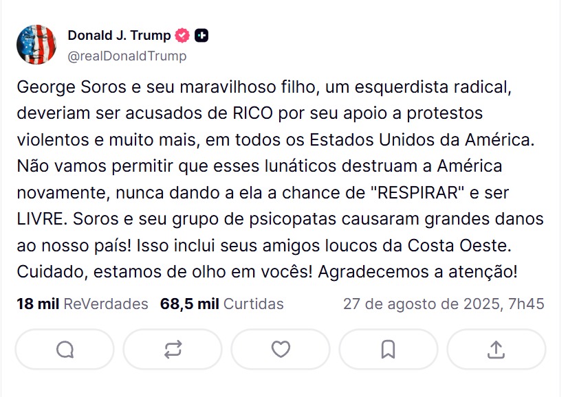 O presidente dos Estados Unidos, Donald Trump, declarou que o bilionário George Soros e seu filho, descrito como “esquerdista radical”, deveriam enfrentar acusações sob a lei federal americana de Organizações Corruptas e Influenciadas por Criminosos (RICO, na sigla em inglês) devido ao suporte a manifestações violentas, conforme postagem feita na Truth Social na quarta-feira (27).