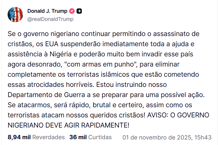 “Por meio deste, instruo nosso Departamento de Guerra a se preparar para uma possível ação”, escreveu Trump. “Se atacarmos, será rápido, brutal e certeiro, assim como os terroristas atacam nossos queridos cristãos! AVISO: O GOVERNO NIGERIANO DEVE AGIR RAPIDAMENTE!”