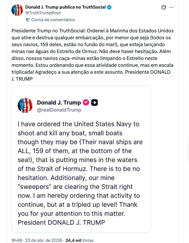 Em uma escalada decisiva na crise do Golfo Pérsico, o presidente Donald Trump utilizou sua plataforma, a Truth Social, nesta quinta-feira (23), para autorizar o uso de força letal contra qualquer embarcação que tente obstruir o Estreito de Ormuz. A medida ocorre em meio a relatos de que o processo de desminagem da região poderia levar meses, impactando a economia global.