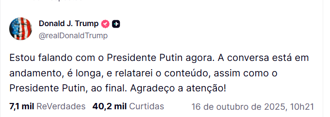 O presidente Trump disse na sua rede social que estava conversando agora com Putin (uma conversa longa) e que no final dará detalhes sobre o que foi conversado. Essa conversa ocorre 1 dia antes da visita de Zelensky à Casa Branca, agendada para amanhã, quando se prevê que Trump anunciará o envio de mísseis Tomahawk para a Ucrânia.