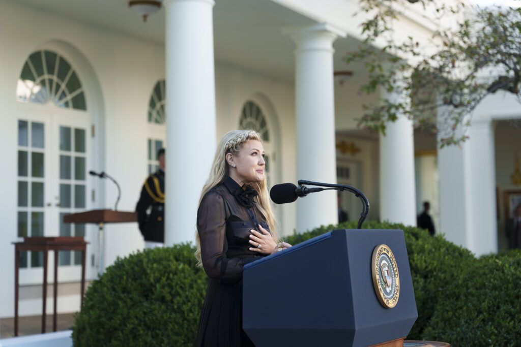 Ao receber a medalha em nome do esposo, Erika Kirk, nova presidente da Turning Point USA, expressou agradecimentos pela honraria.