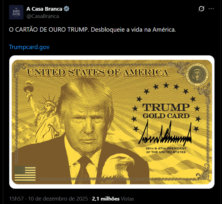 O governo dos Estados Unidos lançou oficialmente na quarta-feira (10) o programa de vistos “Trump Gold Card”, que oferece a cidadãos não americanos uma via, a um preço elevado, para obterem permissão acelerada para viver no país.