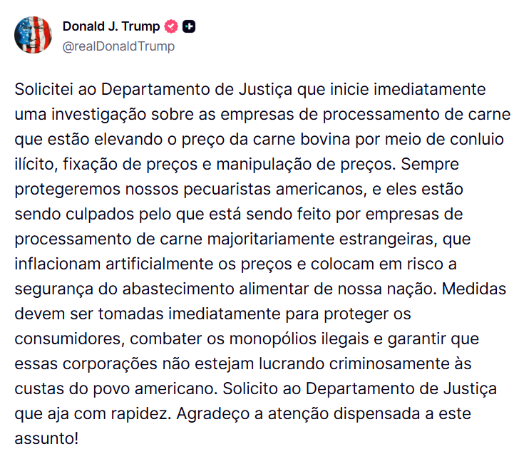 Em postagem na Truth Social, Trump declarou que a iniciativa visa resguardar consumidores, produtores rurais e criadores de gado dos Estados Unidos.