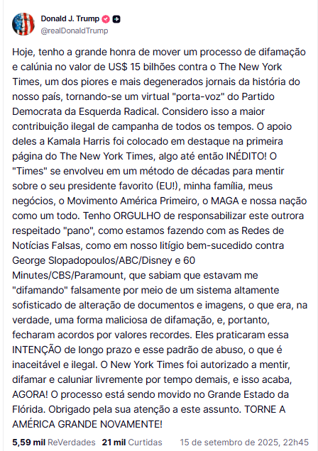 – Ponto chave: Na Truth Social, Trump declara: “Tenho orgulho de responsabilizar este outrora respeitado jornal […] que sabiam que estavam me ‘difamando’ falsamente por meio de um sistema altamente sofisticado de alteração de documentos e imagens”. Isso ecoa vitórias anteriores, como contra CBS por edição seletiva em uma entrevista de Kamala Harris (2024), e acusa o NYT de atuar como extensão do Partido Democrata, justificando os US$ 15 bilhões em danos por “difamação maliciosa”.
