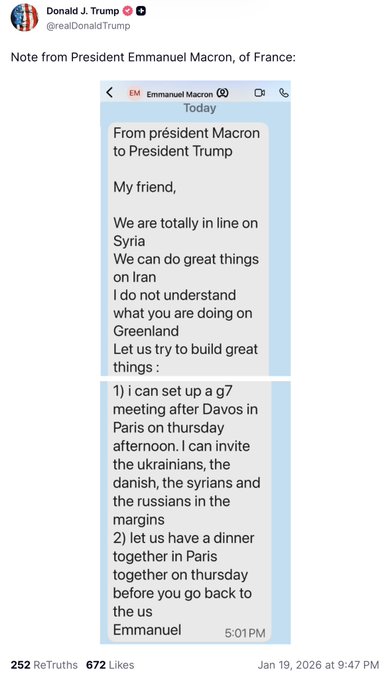 Em seguida, o líder francês apresenta propostas concretas: “1) Posso organizar uma reunião do G7 depois de Davos em Paris na quinta-feira à tarde. Posso convidar os ucranianos, os dinamarqueses, os sírios e os russos à margem. 2) Vamos jantar juntos em Paris na quinta-feira antes de você voltar para os EUA. Emmanuel”.