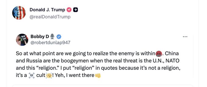 No repost, Trump compartilhou texto de um usuário que diz: “Então, em que momento vamos perceber que o inimigo está dentro. China e Rússia são os espantalhos QUANDO A AMEAÇA REAL É A ONU, A OTAN e esta ‘religião’. Coloquei ‘religião’ entre aspas porque não é uma religião, e…”.