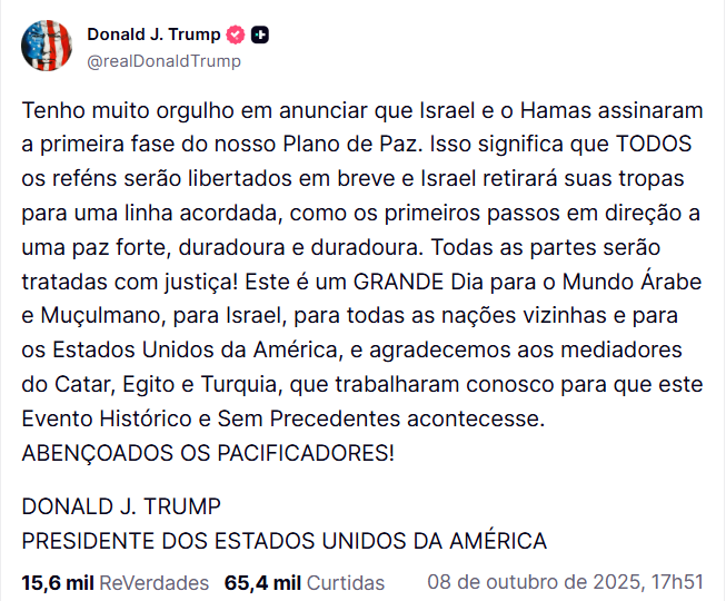 O anúncio ocorreu poucas horas depois de Trump confirmar oficialmente a assinatura de uma primeira fase do acordo de paz para Gaza, elaborado com o apoio de Egito, Catar, Turquia e Estados Unidos e respaldado pela Organização das Nações Unidas (ONU).