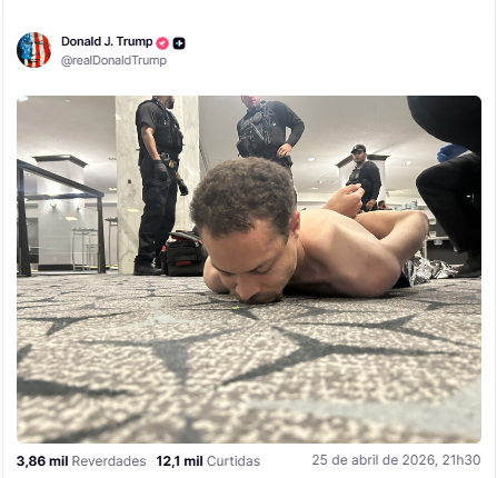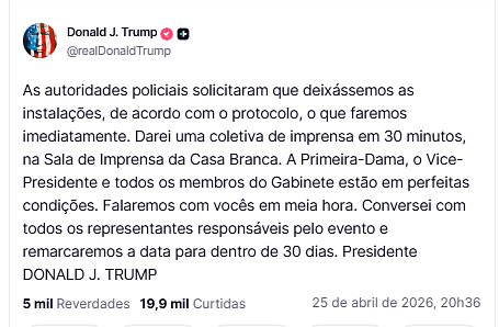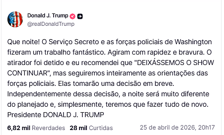O presidente dos Estados Unidos, Donald Trump, fez uma publicação em suas redes sociais, a Truth Social, após ser retirado às pressas do palco pelo Serviço Secreto dos Estados Unidos durante o Jantar dos Correspondentes da Casa Branca, em Washington, na noite deste sábado (25).