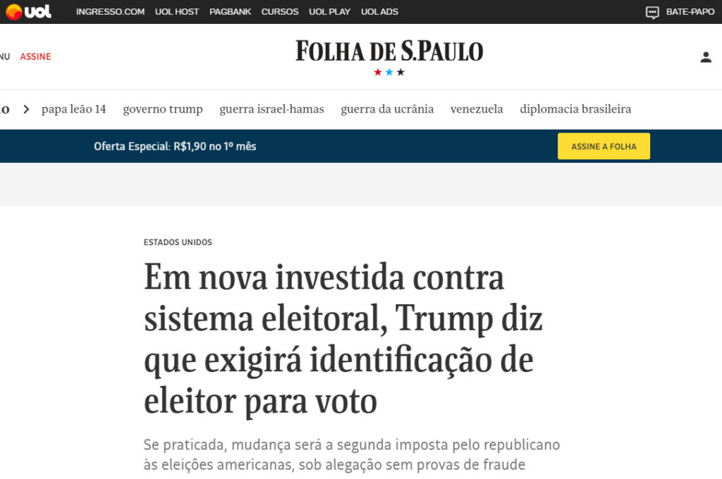 “O documento de identidade do eleitor deve constar em todos os votos. SEM EXCEÇÕES! Vou emitir um decreto para esse fim!!! Além disso, não haverá votação por correspondência, exceto para aqueles que estão muito doentes e para os militares distantes. USE SOMENTE CÉDULAS DE PAPEL!!!”, escreveu Trump em uma publicação na plataforma Truth Social.