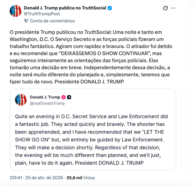Durante uma coletiva de imprensa convocada às pressas na Casa Branca, o presidente elogiou a atuação dos agentes do Serviço Secreto e das forças de segurança, classificando a resposta como “rápida e corajosa”. Ele ainda recomendou que o evento continuasse após a detenção do suspeito, com a frase: “Deixem o show continuar”, CONFIRA: