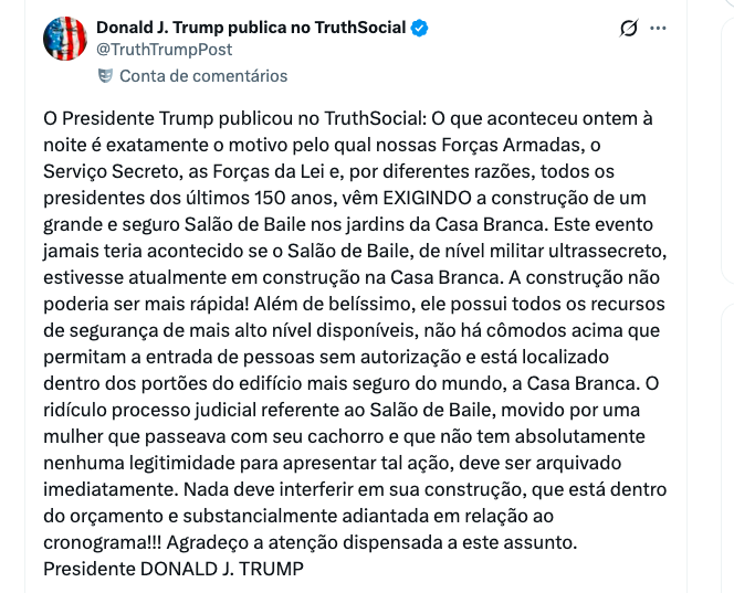 Em pronunciamento e em postagens nas redes sociais, Trump afirmou que os disparos “jamais teriam acontecido” caso o projeto de um amplo salão de baile dentro da residência oficial do presidente já estivesse concluído, CONFIRA: