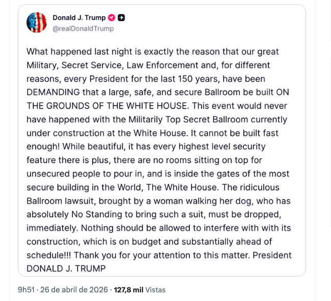 O presidente Donald Trump voltou a defender, neste domingo (26), a construção de um grande salão de festas na Casa Branca após o tiroteio ocorrido durante o tradicional Jantar dos Correspondentes da Casa Branca, realizado no sábado (25) no hotel Washington Hilton.
