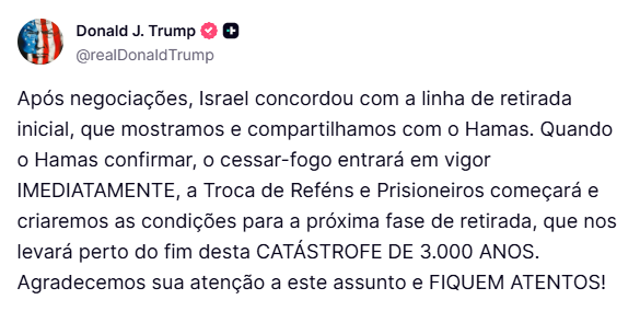 Trump elogiou a decisão de Israel de suspender os ataques aéreos, dizendo que isso dá “à libertação dos reféns e ao Acordo de Paz uma chance de serem concluídos” e enfatizou a urgência do momento, ameaçando o Hamas a agir rapidamente, ou então, “todas as apostas serão canceladas”.