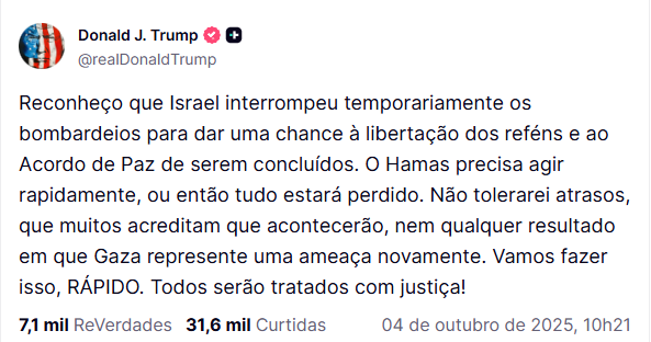 “Agradeço a Israel por ter interrompido temporariamente os bombardeios para dar uma chance à libertação dos reféns e ao Acordo de Paz de serem concluídos. O Hamas precisa agir rapidamente, ou então todas as apostas serão canceladas. Não tolerarei atrasos, que muitos acreditam que acontecerão, ou qualquer resultado em que Gaza represente uma ameaça novamente. Vamos fazer isso, RÁPIDO. Todos serão tratados de forma justa!”, escreveu Trump em uma publicação na Truth Social.