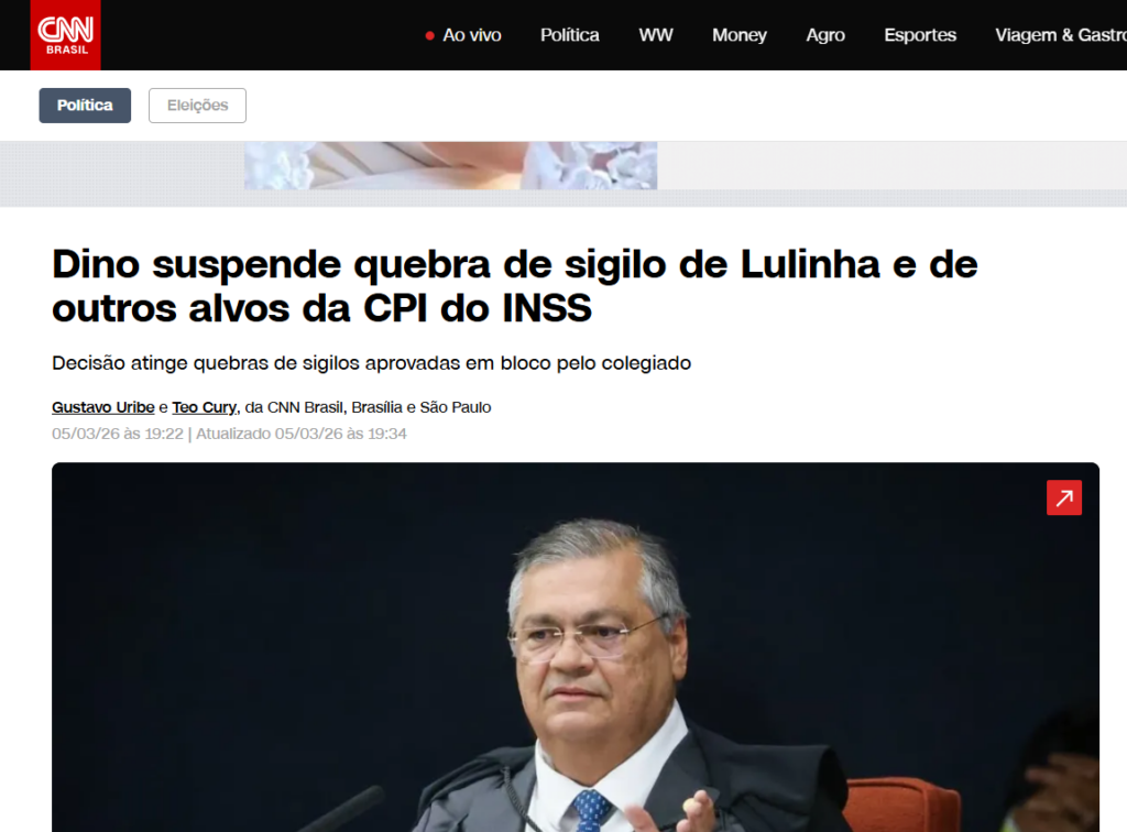 O ministro Flávio Dino, do Supremo Tribunal Federal (STF), determinou nesta quinta-feira (5) a suspensão das quebras de sigilo aprovadas de forma coletiva pela CPMI do INSS.