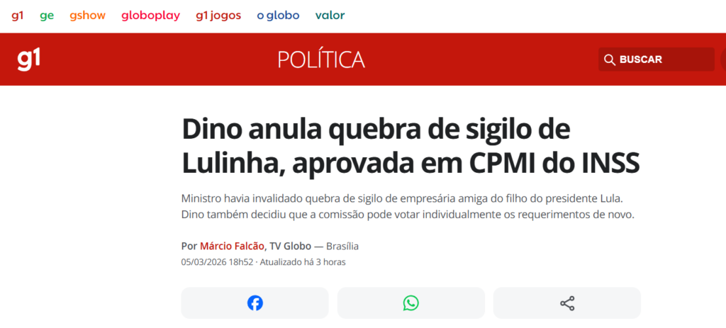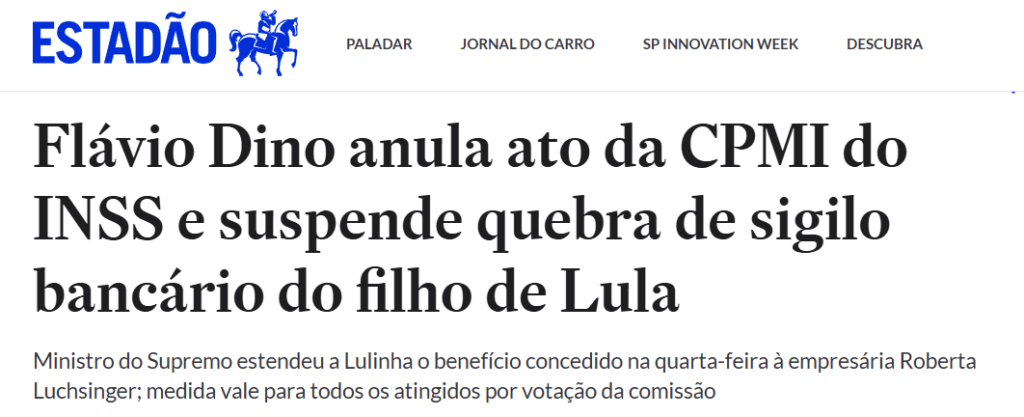 A decisão anterior relativa a Lulinha contava com o aval do presidente do Senado, Davi Alcolumbre (União-AP).Na decisão, Dino afirma que reconhece que a CPMI do INSS “deve, se desejar, proceder à nova deliberação das quebras de sigilo em relação a todos os alcançados” pelaquilo que ele considera uma “equivocada votação”.