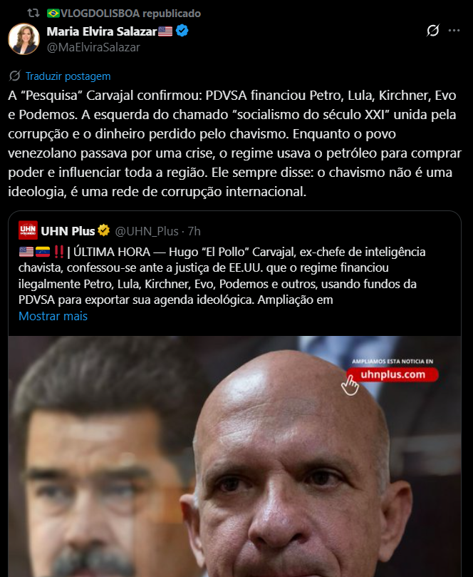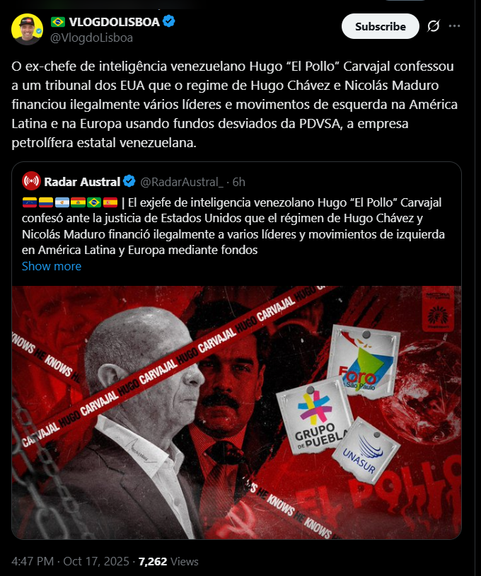 O ex-chefe de inteligência venezuelano Hugo “El Pollo” Carvajal confessou a um tribunal dos EUA que o regime de Hugo Chávez e Nicolás Maduro financiou ilegalmente vários líderes e movimentos de esquerda na América Latina e na Europa usando fundos desviados da PDVSA, a empresa petrolífera estatal venezuelana.