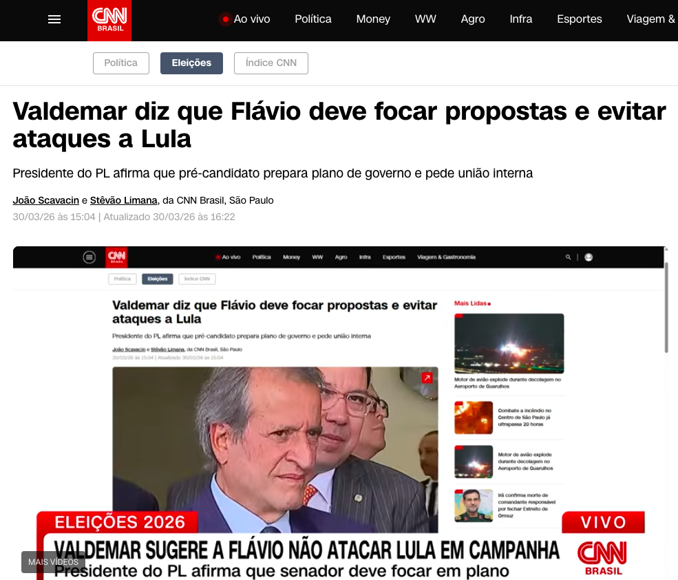 Ouça a análise do jornalista da CNN BRASIL, sobre a declaração de Vlademar Costa neto em que Flávio deve focar propostas e evitar ataque a Lula: