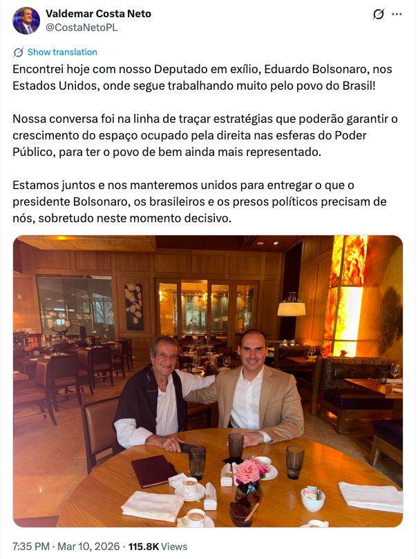 A reunião antecedeu um encontro marcado para quarta-feira (11) entre Eduardo e um grupo de deputados do PL, reforçando a coordenação partidária em meio a negociações internas e externas.