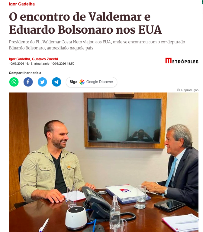 O presidente nacional do Partido Liberal (PL), Valdemar Costa Neto, viajou aos Estados Unidos nesta semana e se reuniu com Eduardo Bolsonaro (PL-SP), que vive no país há cerca de um ano. O encontro ocorreu na tarde de terça-feira (10), em um restaurante na cidade de Dallas, no Texas, e teve como foco principal a articulação eleitoral para 2026, especialmente a disputa pelo Senado em São Paulo, de acordo com a matéria do Metrópoles.