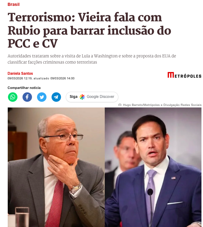 Na conversa, Vieira tentou convencer Rubio de que os EUA não devem classificar facções criminosas brasileiras, como PCC e Comando Vermelho, como organizações terroristas estrangeiras.