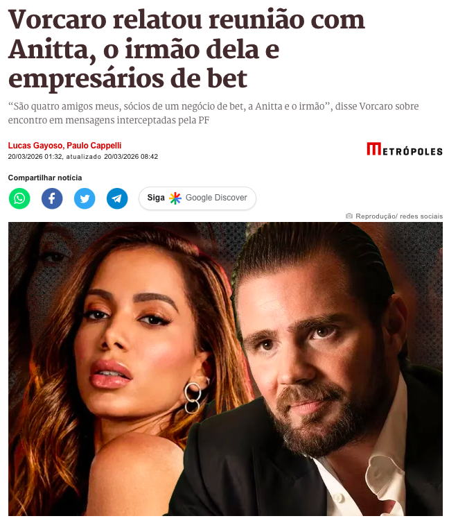 O banqueiro Daniel Vorcaro, ex-controlador do Banco Master e figura central em investigações federais, relatou em mensagens interceptadas pela Polícia Federal (PF) uma reunião que envolveu a cantora Anitta, o irmão dela e empresários do setor de apostas esportivas (bet), de acordo com a matéria do Metrópoles.