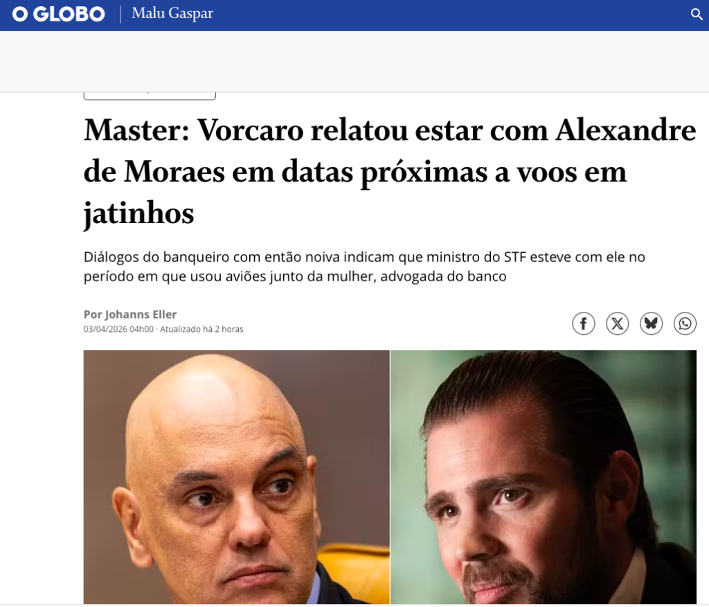 Mensagens trocadas entre o banqueiro Daniel Vorcaro, ex-controlador do Banco Master, e sua então noiva Martha Graeff revelam que o ministro do Supremo Tribunal Federal (STF), Alexandre de Moraes, esteve com ele em datas próximas às viagens realizadas pelo magistrado e pela esposa, Viviane Barci de Moraes, em jatos executivos ligados a Vorcaro, de acordo com a matéria do O GLOBO.