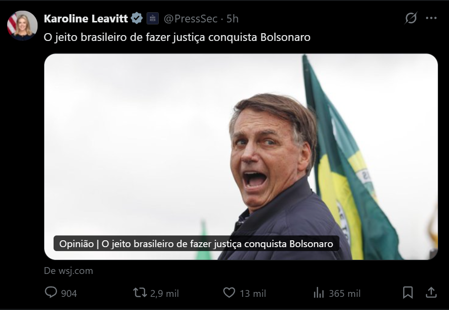 O perfil oficial de Karoline Leavitt no X é@PressSec (como Porta-voz da Casa Branca). A postagem em questão, publicada hoje (15 de setembro de 2025), compartilha o artigo do Wall Street Journal intitulado “The Brazilian Way of Lawfare Gets Bolsonaro”.