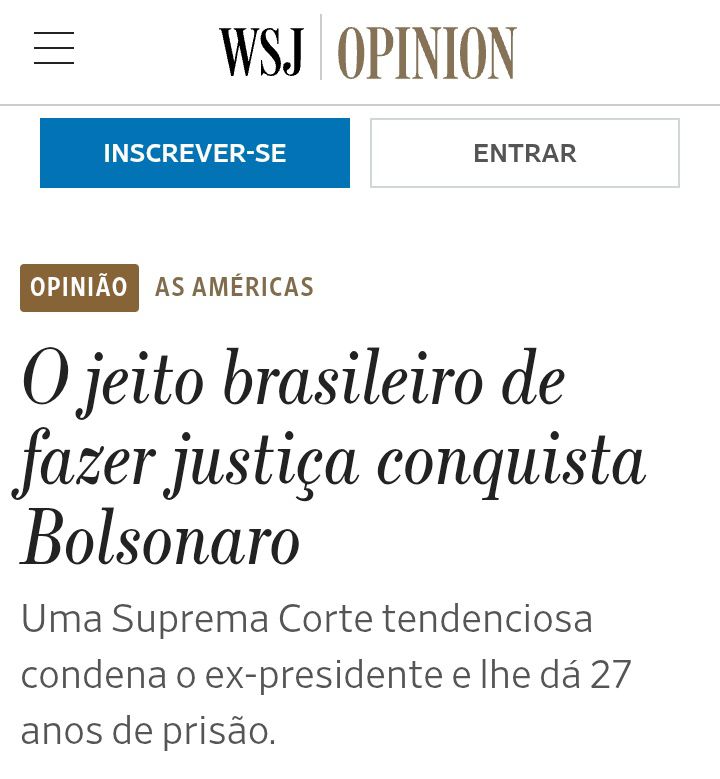 Um texto de opinião publicado no jornal americano Wall Street Journal, escrito por Mary Anastasia O’Grady, colunista da publicação, no domingo (14/9), sugere que “o jeito brasileiro de praticar ‘lawfare’ pegou Bolsonaro”, referindo-se à sentença de 27 anos imposta ao ex-presidente brasileiro por tentativa de golpe de Estado, decidida pelo Supremo Tribunal Federal (STF).