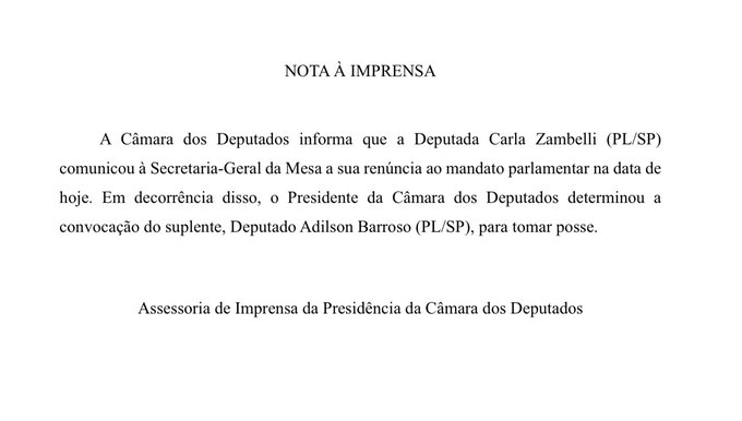 “Renuncio. Não por medo, não por fraqueza, não por desistência. Comunico, de forma pública e solene, minha renúncia para denunciar que um mandato legitimado por quase um milhão de votos foi interrompido apesar do reconhecimento formal, por esta Casa, da inexistência de provas para sua cassação”, afirmou Zambelli.