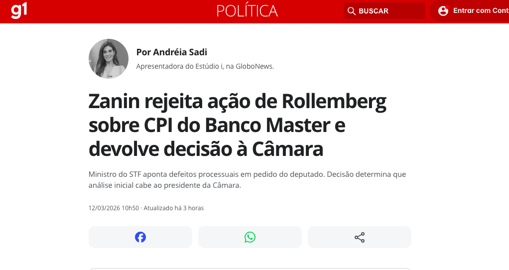 O ministro Cristiano Zanin, do Supremo Tribunal Federal (STF), rejeitou o mandado de segurança apresentado pelo deputado Rodrigo Rollemberg (PSB-DF) que buscava obrigar a Câmara dos Deputados a instalar imediatamente a CPI do Banco Master. Em decisão monocrática, Zanin devolveu a competência para a Casa Legislativa, afirmando que não há direito líquido e certo a ser protegido por via judicial nesse estágio, de acordo com a matéria do G1.