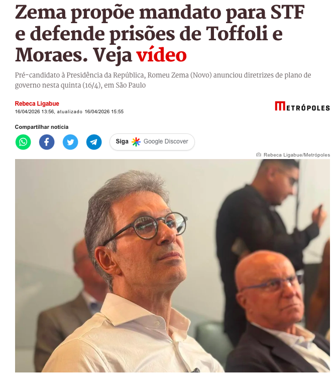 O governador de Minas Gerais, Romeu Zema (Novo), pré-candidato à Presidência da República, defendeu uma profunda reforma no Supremo Tribunal Federal (STF) e chegou a sugerir a prisão de dois ministros da Corte, de acordo com a matéria do Metrópoles.